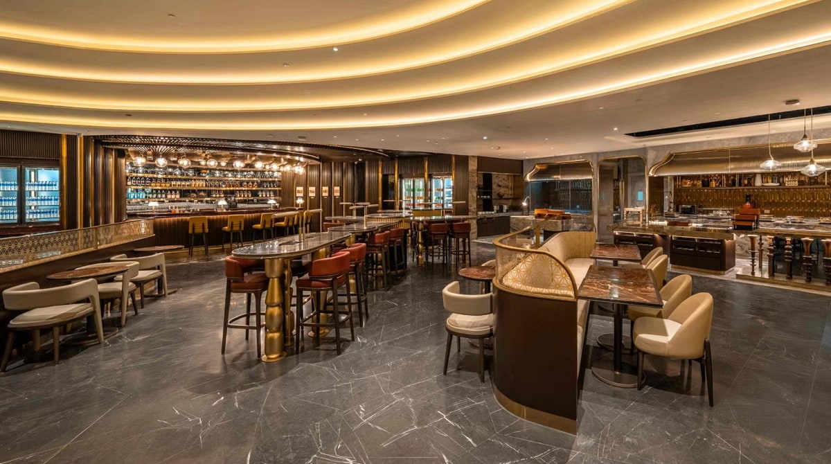 - The Aviator’s Bar pays tribute to the airline’s origins, drawing inspiration from the historic 1932 flight piloted by J. R. D. Tata from Karachi to Bombay. The ceiling design echoes the propeller of the Puss Moth aircraft, while the bar offers a curated selection of premium wines and whiskies.